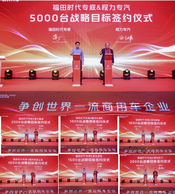 2026年2月28日,炎帝故里、专汽之都随州迎来行业盛事——2026福田时代专底旺季启动会暨战略目标签订仪式圆满启幕。本次活动邀请程力汽车集团股份有限公司副总经理、底盘供销公司总经理刘峰,全柴动力股份有限公司董事长徐玉良,昆明云内动力股份有限公司营销公司总经理王北军、广西玉柴机器股份有限公司营销公司总经理李灿杰以及凯力汽车集团、盈通汽车、中车楚胜80余家改装厂企业出席;同时,北汽福田专用车业务总监、战略客户事业部常务副总裁张春雨,北汽福田时代事业部运营副总裁李炜,北汽福田时代事业部副总裁、瑞沃业务总裁、瑞沃营销公司总经理邓路华等领导出席会议。会议共计200余人,齐聚一堂共话行业发展新趋势,共绘时代汽车争创世界一流商用车企业的发展蓝图,携手开启旺季新征程。