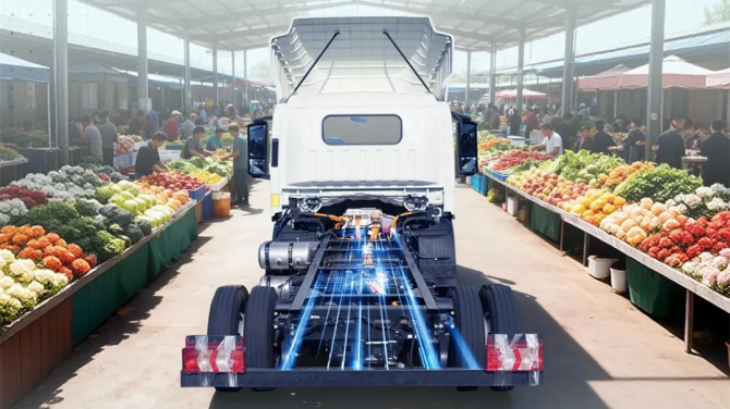 更给力的是,宝钢QSTE650高强度钢材打造的200×70×5mm的直通梁,配合行业领先的865mm开档车架、1715mm宽轮距后桥以及多种板簧悬挂,使其承载能力远超同级。王师傅还特别关心电池,“动力电池位于车架纵梁内侧,且离地间隙高达380mm,让我轻松通过非铺装路段,防碰撞更安全,完全不用担心电池受损。”