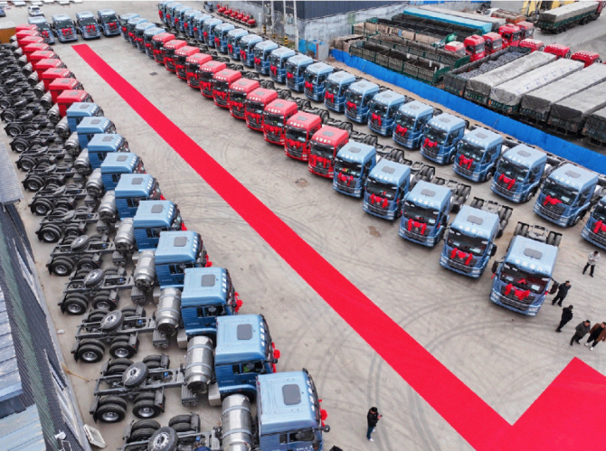 近日,60台豪沃TX燃气车正式交付山东冠县大客户。现场车辆身披红绸、整齐列队,这批“节气先锋”即刻奔赴运输一线,为鲁西物流枢纽高质量发展注入强劲动能。